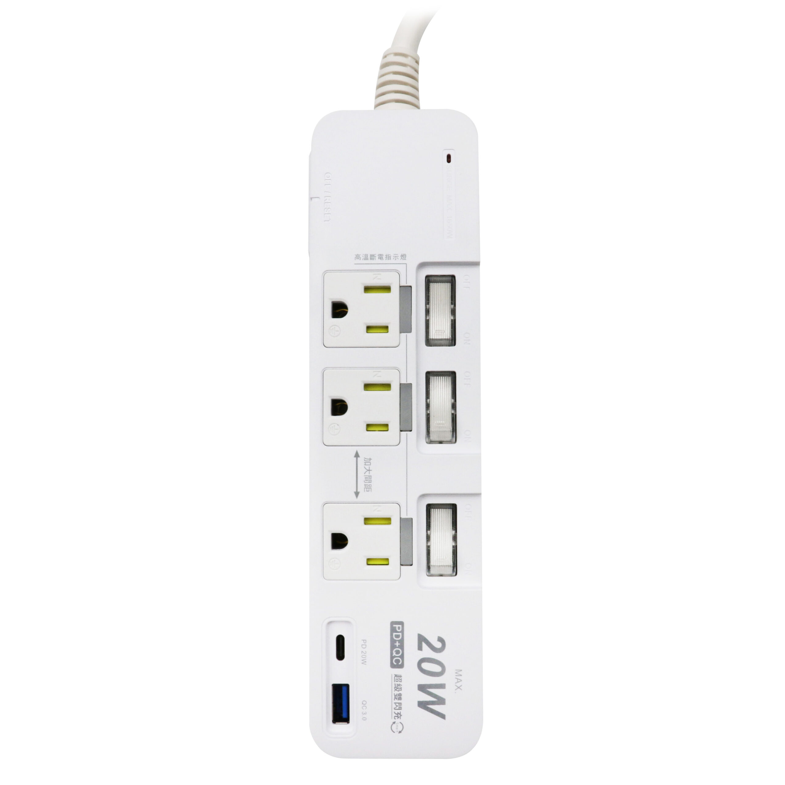 ◆產品規格:3口,3孔,PD20W(Type-C)+QC3.0(Type-A)
