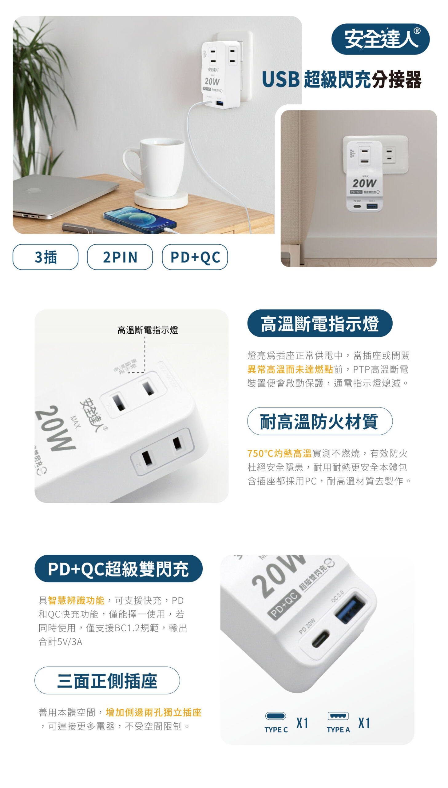 【安全達人R-05P】3插2P 20W USB超級閃充分接器(壁插)
