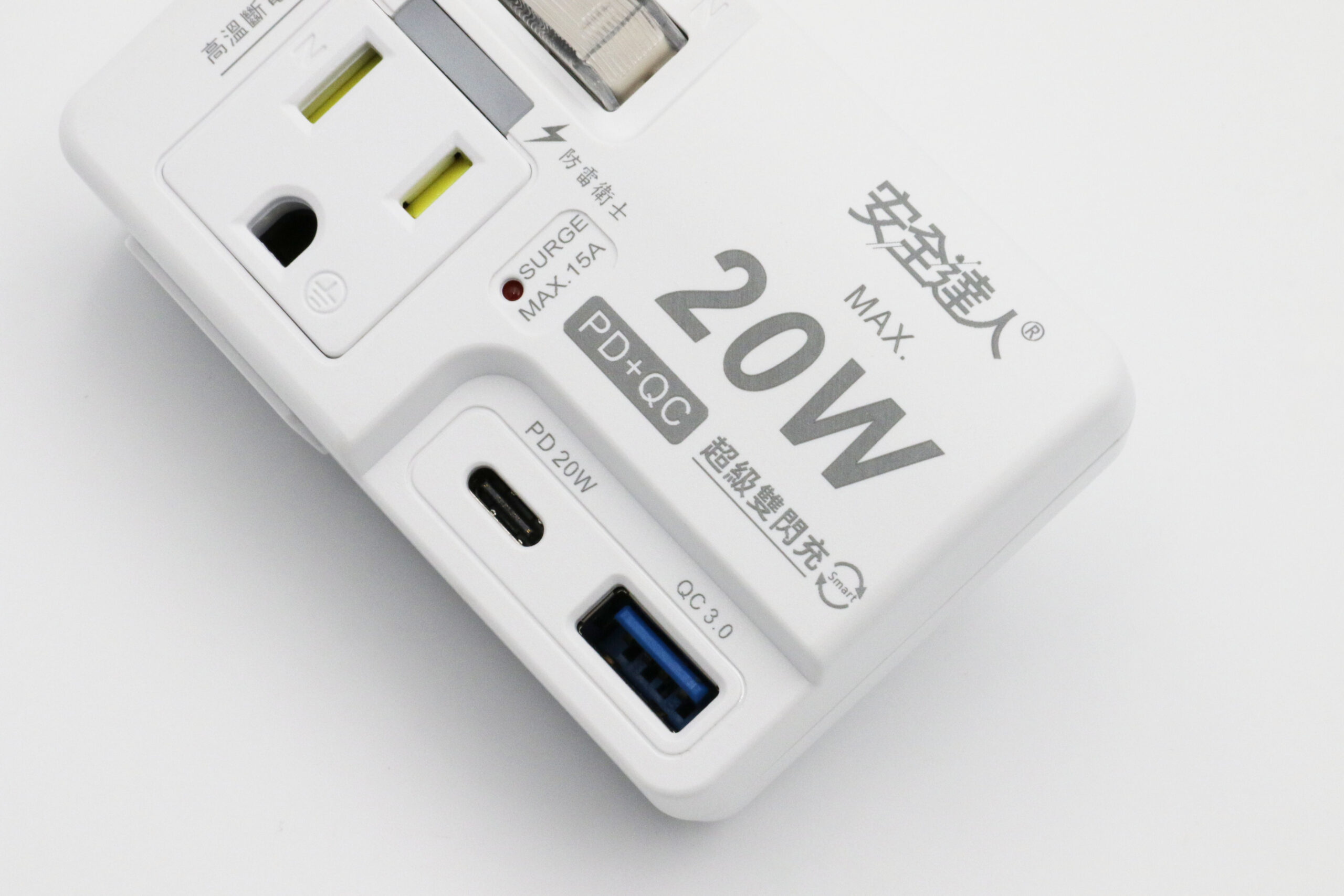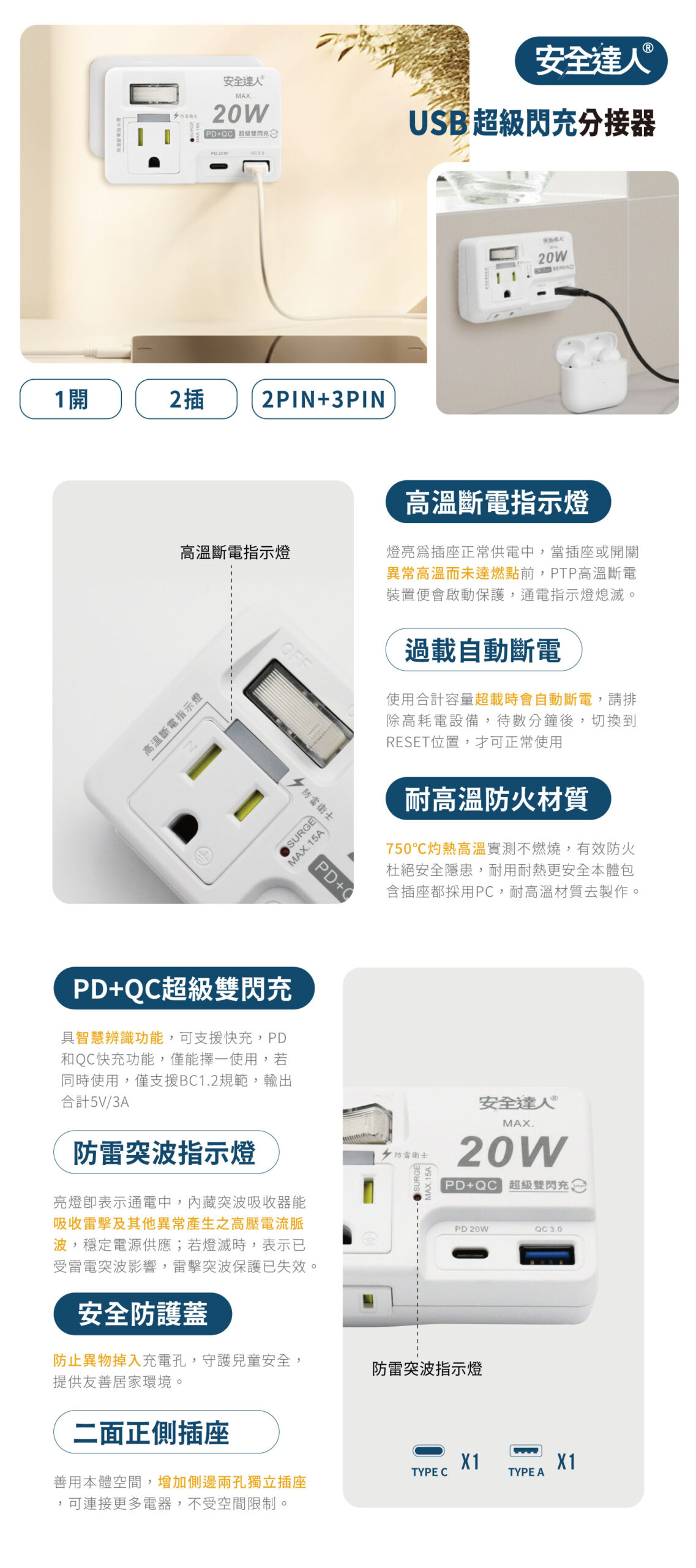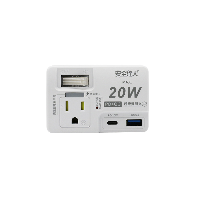 【安全達人R-61PLC】1開2插2P+3P 20W USB超級閃充分接器